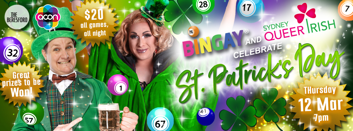 Join us on Thursday 12 March for our first St Patrick’s Day edition of Bingay. To help us ring in Ireland’s iconic holiday, we have teamed up with Sydney Queer Irish to deliver a knock-out, green-themed Bingay. We’ll be turning The Beresford into an emerald wonderland, complete with a camp Irish pop soundtrack.